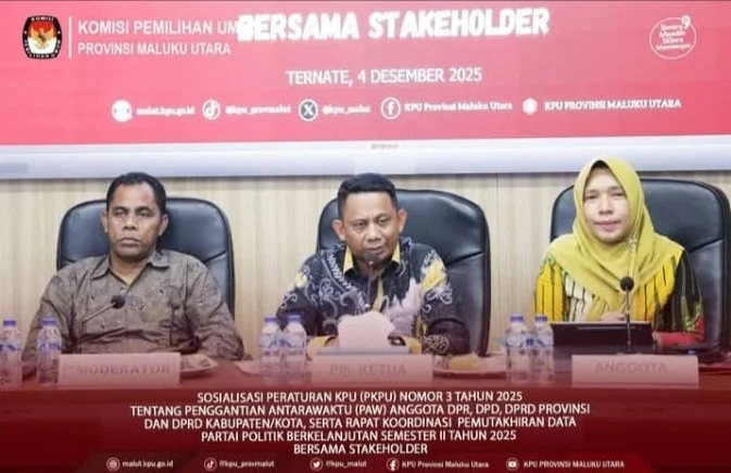 KABARINDONESIANEWS.COM — Komisi Pemilihan Umum (KPU) Provinsi Maluku Utara menggelar Sosialisasi Peraturan KPU (PKPU) Nomor 3 Tahun 2025 tentang Penggantian Antarwaktu (PAW) Anggota DPR, DPD, DPRD Provinsi, dan DPRD Kabupaten/Kota. Kegiatan tersebut dirangkaikan dengan Rapat Koordinasi Pemutakhiran Data Partai Politik Berkelanjutan Semester II, Kamis kemarin, (4/12).