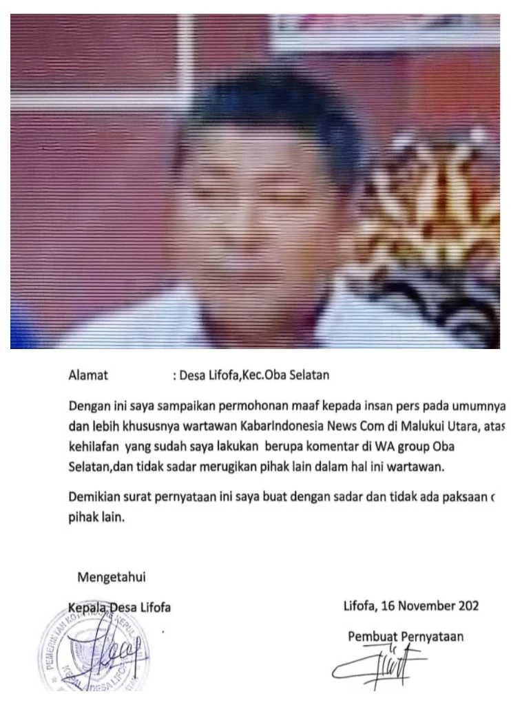“Dengan ini saya menyampaikan permohonan maaf kepada insan pers pada umumnya, dan khususnya kepada wartawan KabarIndonesiaNews.com di Maluku Utara, atas kekhilafan yang saya lakukan berupa komentar melalui WhatsApp di Grup Oba Selatan. Tanpa sadar, saya telah merugikan pihak lain, khususnya jurnalis atau wartawan.”